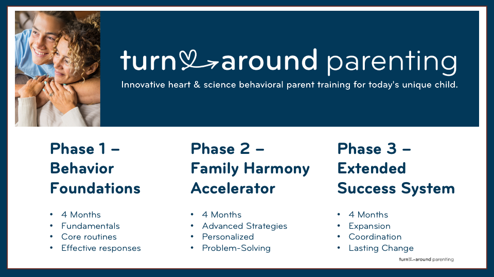 The Turn Around Parenting process is designed to fit into the busy life of parents and caregivers, using a hybrid approach that creates lasting change!